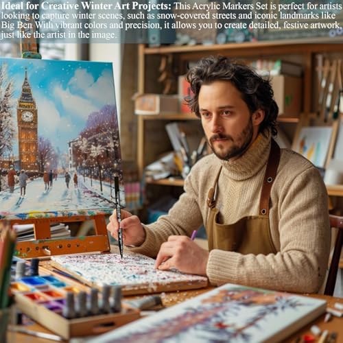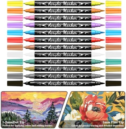 This Acrylic Markers Set features a 0.4″ fine tip for precise detailing and a flexible brush tip for thicker strokes, offering versatility for all types of artistic projects. The water-based ink ensures smooth application and vibrant, consistent color, perfect for fine lines.