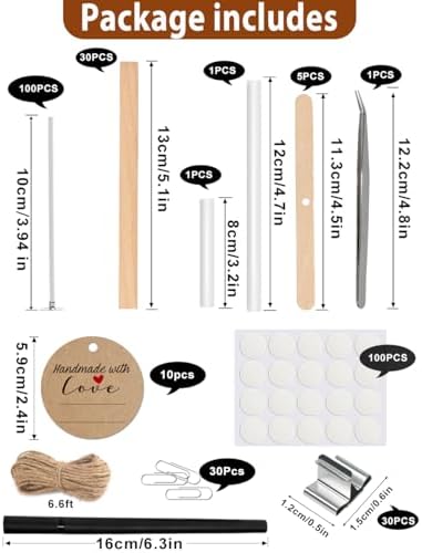 Candle Making Kit:Includes 100 cotton wicks, 30 wooden wicks, 5 wick holders, 30 metal bases, 30 paper clips, 100 wick stickers, 2 wick placing tube, 10 candle tags, 1 pen, 6.6ft string & 1 tweezers.