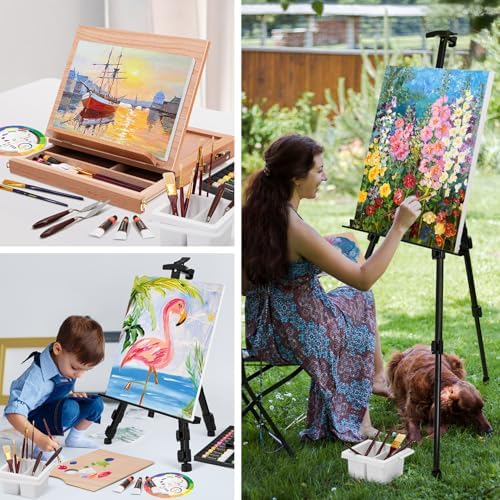149-Piece Ultimate paint set – Unleashing your inner artist with this 149-Piece all-inclusive painting set! Bundle includes 2 easels(1 aluminum tripod easel and 1 Wood Desk Table Easel), 3 kids of paints(48 colors acrylic paints ,24 colors watercolor paints, 24 colors oil paints) , 3 sets of basic paintbrush, 3 drawing paper pad, 2 stretched canvas(11”x14“), 6 canvas panels(8”x10“) ,5 palette knifes,2 paint palettes,1 Paint Brush Basin,1 color wheel. It includes everything you need to get started!