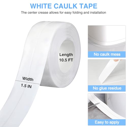 RHRVBSS 2 ROLLS WHITE CAULK TAPE – Each roll Width: 1.5 inch, Length: 10.5 feet – The tape caulk strip measuring 1.5 inches in width, 10.5 feet in length, the waterproof caulking sealant tape with a crease in the center makes it easy to fold and install.