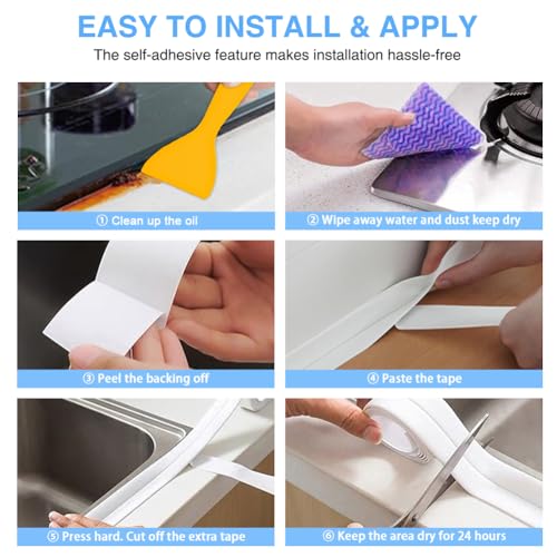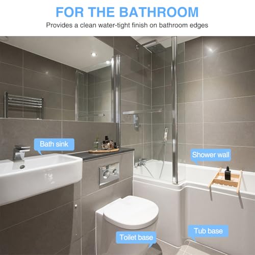 WIDE APPLICATION – The caulk tape sealant provides a clean water-tight finish on bath and kitchen edges to prevent water from seeping into the joints, for toilet, tub, sink, shower, floor tile, wall, peel and stick, wall paper, wallpaper, contact paper, window, corner, kitchen counter top, cabinet, backsplash, bath vanity, mirror frame border, baseboard, splash guard, toilet caulk tape, bathroom decor, bathroom sealant strip for vinyl, wood, marble, glass, metal, plastic, wood, tile surface.