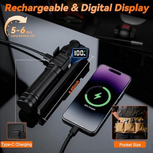 Rechargeable & Digital Display: This rechargeable work light has a high-performance battery, offering 5-6 hours at max brightness and longer on other settings to support long-hour lighting. Meanwhile, the rechargeable flashlight comes with a clear digital display that shows real-time battery level, letting you check power at a glance and avoid sudden outages disrupting work.