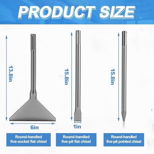 Dimensions: flat and pointed chisels are approximately 16 inches long, and the scraping chisel is 13.8 inches long; These 0.7-inch diameter bits fit into your SDS Max hammer drill