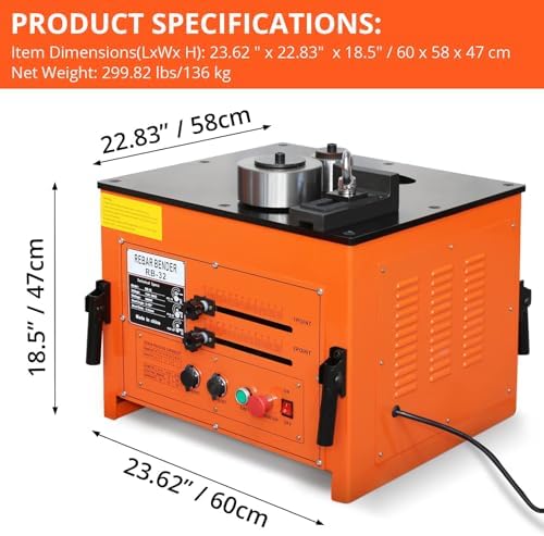 Max. Rebar Diameter: 1/4” #2 Grade 60 Min. Rebar Diameter: 1.3″ #8 Grade 60 Bending Angle: 0°-180° Bending Speed: 6-7 Seconds Bending Radius: 1.57” / 40 mm Max. Rebar Hardness: HRC30 Voltage: 110V Power: 3000W Frequency: 60 Hz Amps: 27A Noise: 92 dB(A) Material: Iron Model: RB-32 Certificate: CE Item Dimensions(L x W x H): 17″ x 19.5″ x 15″ Net weight: 299.82 lbs