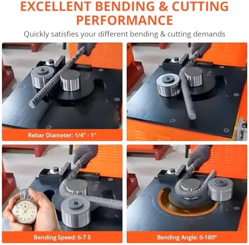 Ultra-Fast Bending: Bend rebar from 1/4 inch to 1.3 inches in just 6 to 7 seconds with a precise 0-180° bending angle and a 1.57 inch bending radius, saving time and boosting productivity on any job site.