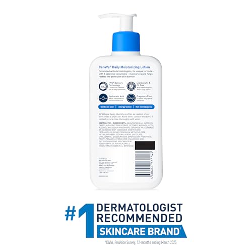 Developed with dermatologists, CeraVe Daily Moisturizing Lotion has a unique, lightweight and non-greasy formula that provides 24-hour hydration with slow release of MVE Technology and helps restore the protective skin barrier with three essential ceramides (1,3,6-II). The formula also contains hyaluronic acid to help retain skin’s natural moisture. This oil-free moisturizer with hyaluronic acid leaves the skin feeling comfortable and is gentle on skin.