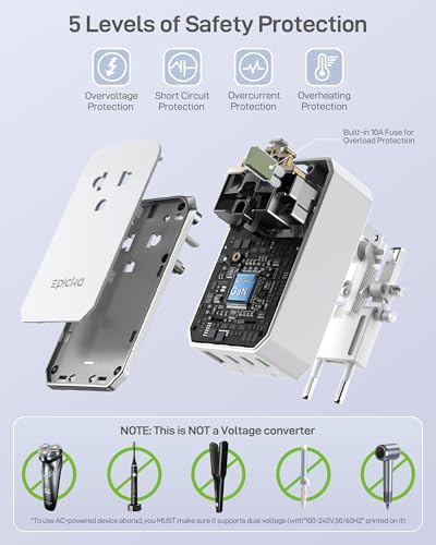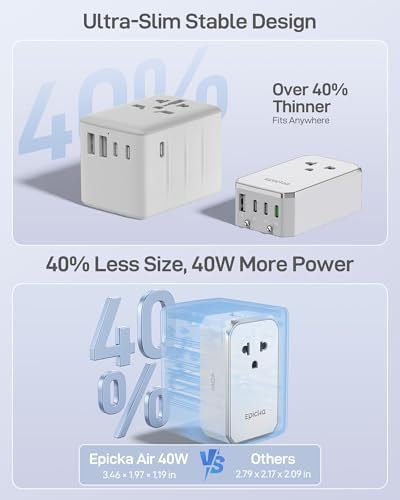 Next-Level Tech in a Compact Size: Unlike standard travel adapters, the EPICKA Air 40W adapter achieves PD 40W fast charging inan ultra-slim, travel-ready design, capable of charging the iPhone 17 to 50% in just 20 minutes, and is suitable for dual voltage products including but not limited to laptop, smartphones, smart watch and fitness tracker, tablet, power bank, camera, handheld game console, headsets etc.