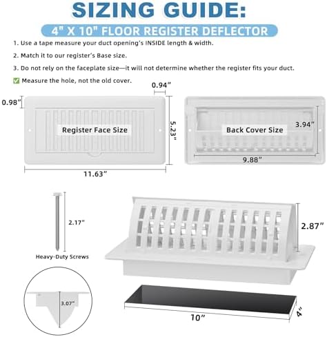 Perfect-Fit 4×10 Floor Vent Cover for Standard Ducts – Engineered for standard 4×10 duct openings, this floor register ensures seamless installation with no air gaps. The exact dimensions match typical 4×10 register vent cover requirements, while integrated vent deflectors boosts your HVAC system’s efficiency right out of the box (no extra parts needed)