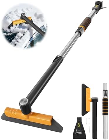 𝗥𝗘𝗧𝗥𝗔𝗖𝗧𝗔𝗕𝗟𝗘 𝗖𝗔𝗥 𝗦𝗡𝗢𝗪 𝗕𝗥𝗨𝗦𝗛 :This retractable car snow brush and ice scraper features a telescopic rod with 12 adjustable lengths, extending from 29.3″ to 43.7″. It effortlessly cleans hard-to-reach areas like SUV roofs and windshield centers, making it the versatile cleaning tool for any vehicle.