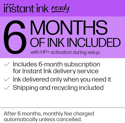 6 MONTHS OF INK INCLUDED when you activate HP+ – Subscribe to Instant Ink delivery service to get ink delivered directly to your door before you run out. After 6 months, monthly fee applies unless cancelled