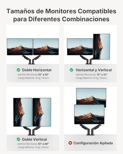 Compatible with Wide Screens – To ensure compatibility with the dual monitor mount, your each monitor must meet three conditions at the same time: First, computer screens size range: 13 to 32 inches. Second, screen weight range: 4.4 to 19.8 lbs. Third, the back of the monitor screen must have VESA mounting holes with a pitch of 75x75mm or 100x100mm.