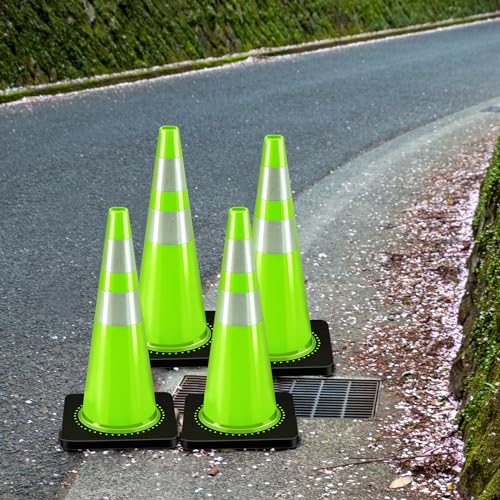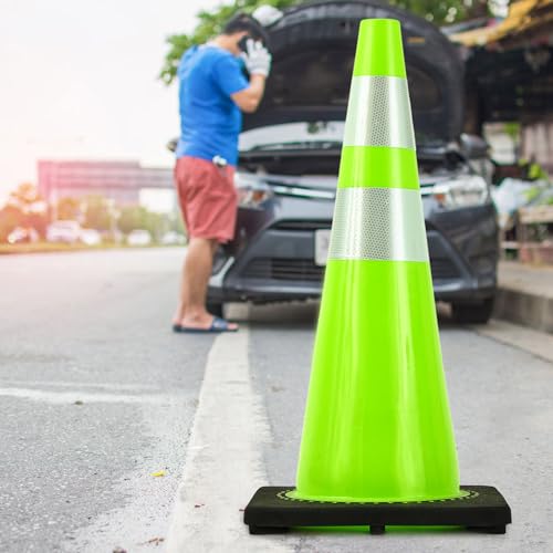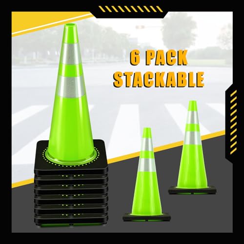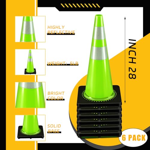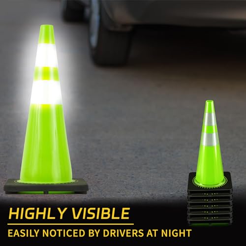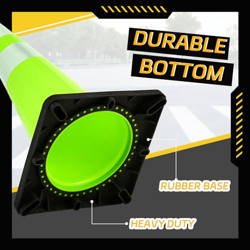 Brilliant Lime Green Color: the driving cones for training stand out with their brilliant lime green color, ensuring maximum visibility during the day and night; The bright color enhances safety as it’s easy to spot from a distance, and the reflective collar design makes them crucial for demarcation areas, traffic management, and emergency situations