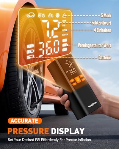 【Accurate Auto Stop — Set PSI Once and Inflate with Confidence】This digital tire inflator with auto shut off uses a high-precision pressure sensor to stop at your preset PSI automatically, preventing overinflation and eliminating guesswork. The bright digital display shows both real-time and target pressure for clear, confident inflation—day or night, in your garage or on the roadside.