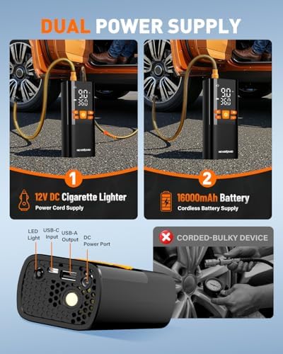 【Ready Power System — Type-C & 12V DC for Anytime Emergencies】Never worry about power when you need it most. The high-capacity battery offers consistent performance, while USB-C charging keeps your cordless tire inflator portable air pump ready for everyday use. In roadside emergencies, simply connect to your vehicle’s 12V DC outlet to inflate without relying on battery levels—ideal for cold mornings, long trips, and unplanned tire issues.