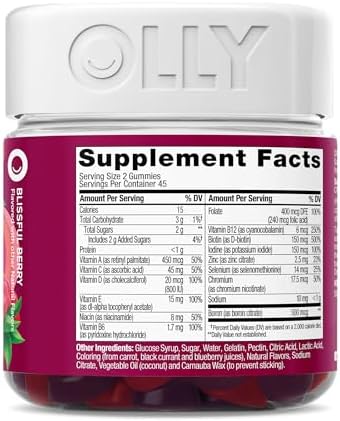 Go big with OLLY Women’s Multi gummies, a delicious, scientifically formulated, gluten free gummy vitamin for health and wellness. Our Blissful Berry flavor with other natural flavors gummy vitamins for women include nutrients to nourish you daily so you can keep doing your thing. This womens multivitamin blend features B Vitamins to support cellular energy, Vitamin D to support bone health* and Vitamins A, C & E. The chewable daily vitamins are a blend for overall wellness and to help fill the gaps when your eating habits are a little less than perfect.* We’ve made it our mission to champion better wellbeing, for all. We do it by crafting products that are as effective as they are delicious—because we know when something feels good, you’re more likely to do it.* *These statements have not been evaluated by the Food and Drug Administration. This product is not intended to diagnose, treat, cure or prevent any disease.