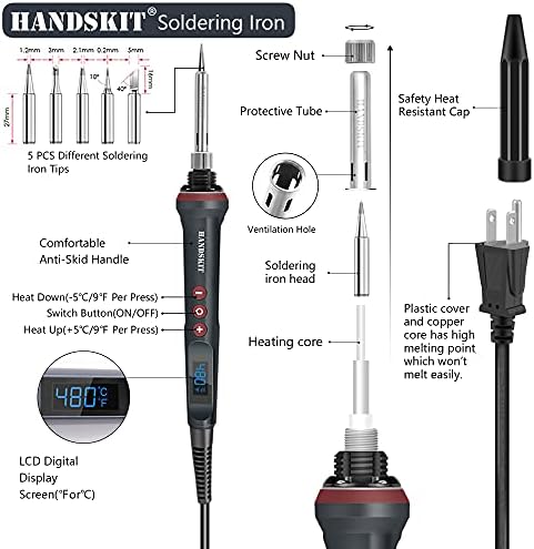 HANDSKIT soldering iron kit designed with adjustable temperature and thermostatic ,on/off switch, LCD display ,Conversion between Celsius ( 180-480℃) and Fahrenheit (356-896℉).In addition, it can set sleeping time preference and adjust temperature manually.