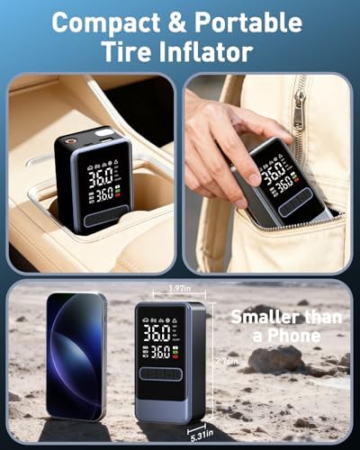 High Capacity Battery:Portable tire inflator for car has a built-in high-capacity rechargeable battery, which can inflate car tyres (29-36 psi) with one full charge. The mini air compressor portable uses Type-C and USB-A ports and can be used as a mobile power source in case of emergency
