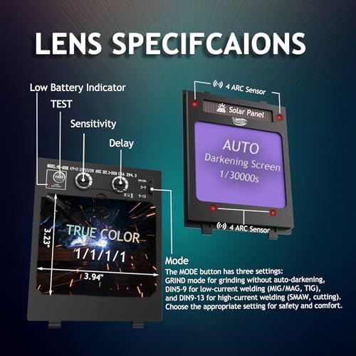 【Rapid Response】: 4 premium sensors,Switches from light to dark in just 1/30,000 seconds, with adjustable tint and sensitivity for various welding applications (TIG/MIG/ARC).Dark state level: 4/5-13.