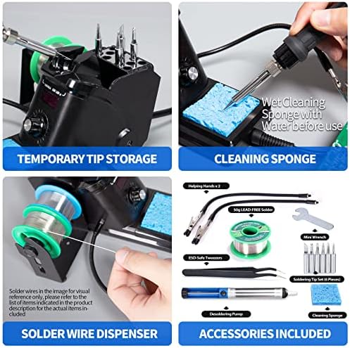 12-IN-1 – This soldering iron kit includes the YIHUA 926 III Soldering Station, 2 Helping Hands, 6 Soldering Tips(YIHUA #1200/900M Series), Roll of Lead-free Solder Wire (35g), Solder Sucker, ESD Safe Tweezers, Solder Wire Dispenser, Cleaning Sponge.